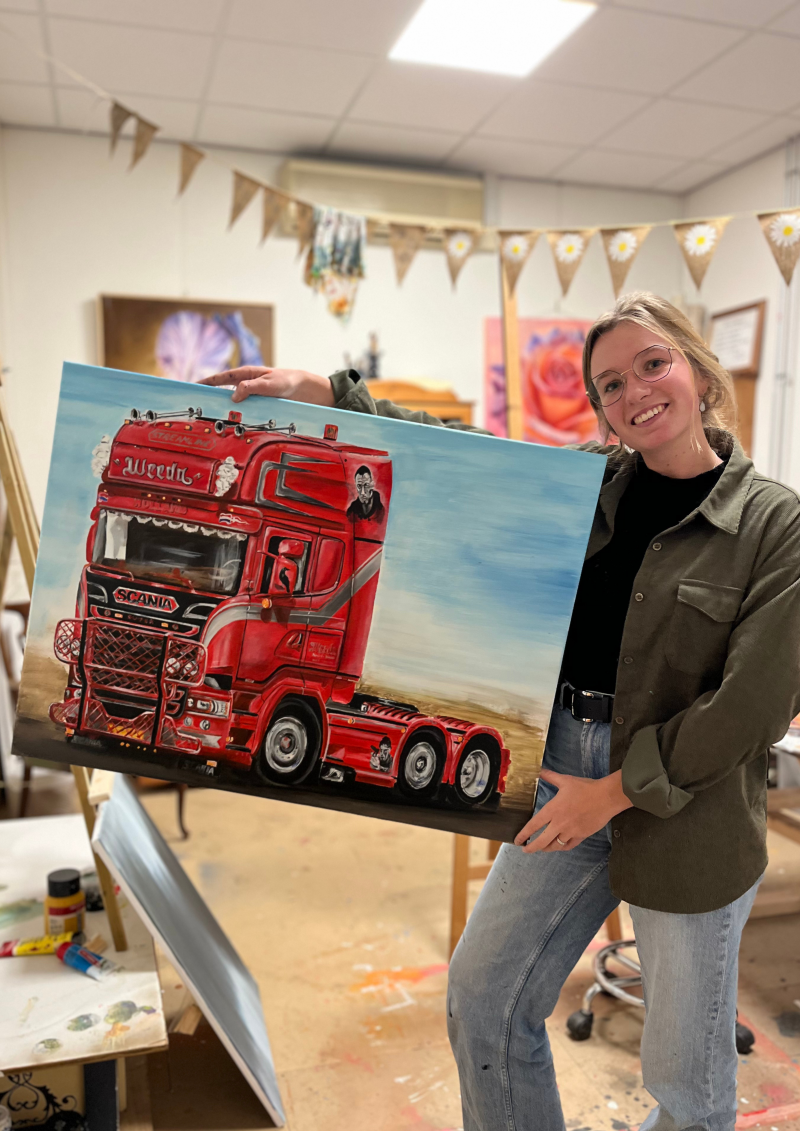 Voor een unieke ervaring kunnen chauffeurs deelnemen aan een creatieve workshop in mijn atelier in Raalte. Tijdens de workshop schilder je je eigen vrachtwagen of maak je een tekening van je truck. Het is een persoonlijke, creatieve activiteit die zowel leuk als memorabel is. Zo combineer je de passie voor je werk met een nieuwe, artistieke ervaring.